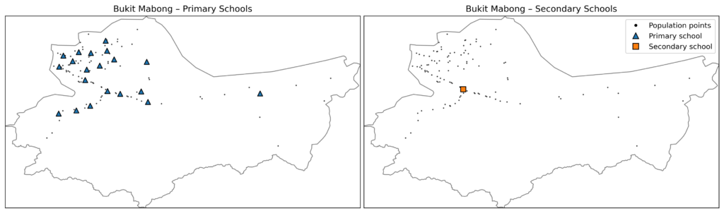 A comparison of population points and school locations in Bukit Mabong, one of the most rural districts, for primary and secondary schools.