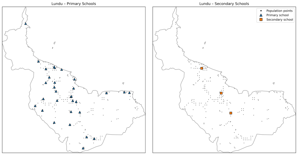A comparison of population points and school locations in Lundu, a mixed semi-urban-rural district, for primary and secondary schools.