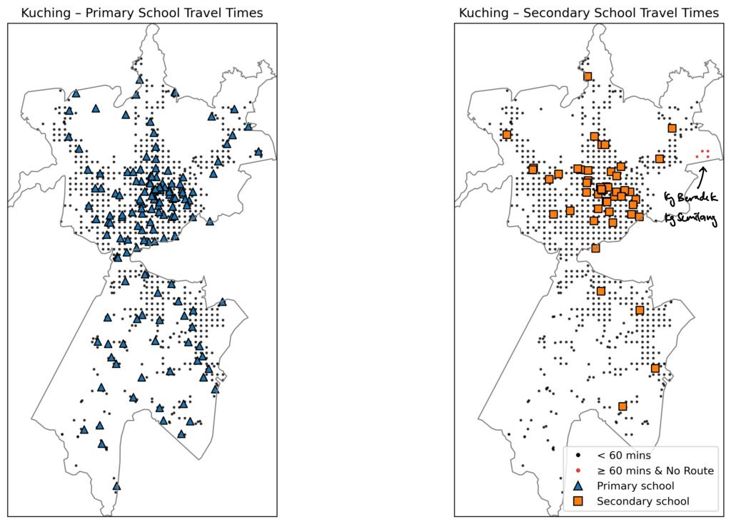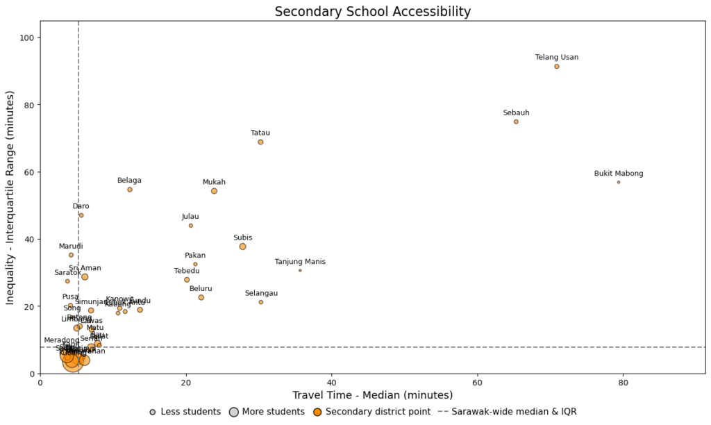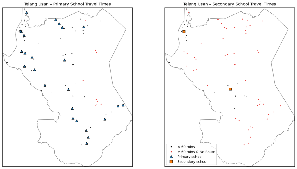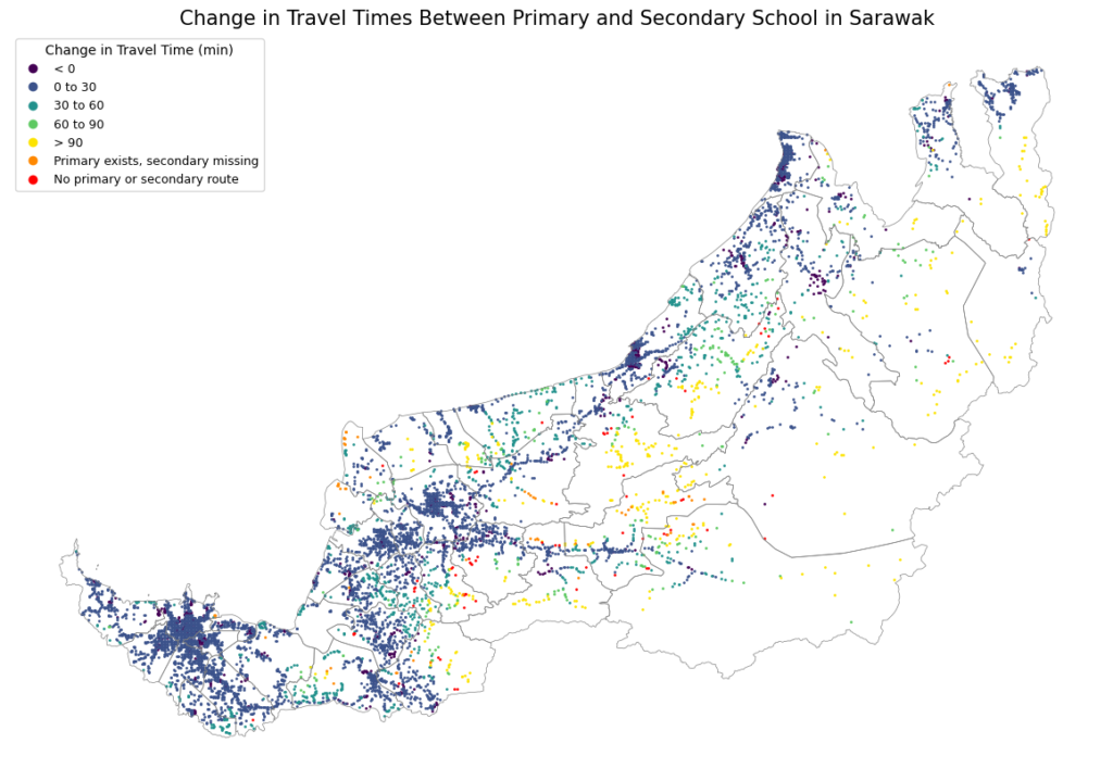 A key difference between primary and secondary schools is where the schools are located. Primary schools tend to be widely distributed, typically located close to kampungs or longhouses. In contrast, secondary schools are far more centralised, typically clustered in towns or cities and serving much wider catchment areas. As a result, both travel times and inequality increases sharply at the secondary school level. Not only does the number of students cut off from regular school access increases, but schools also become less walkable, meaning that rural students have to rely on boats and unpaved routes to get to school.