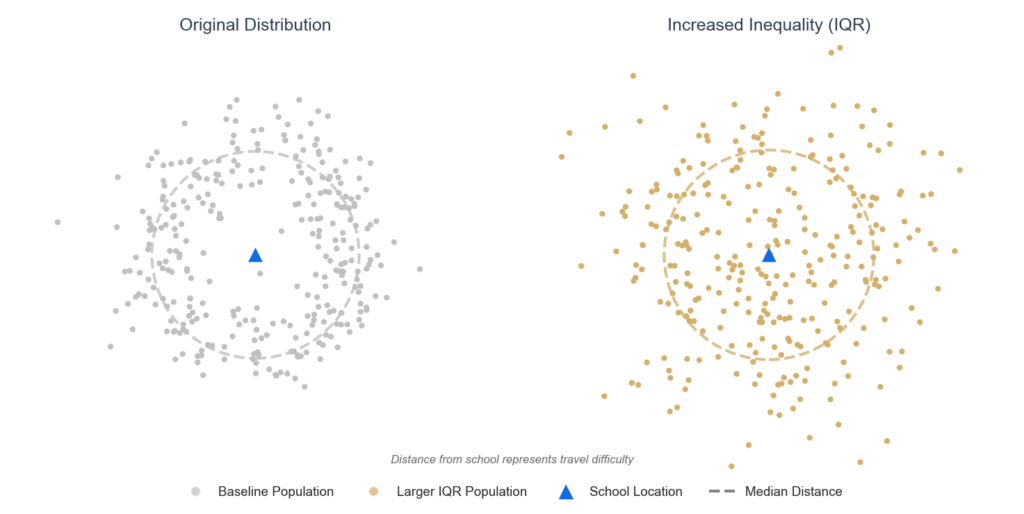 This is the difference between students who live relatively near (25th percentile) and those much further away (75th percentile). A larger gap means greater inequality.