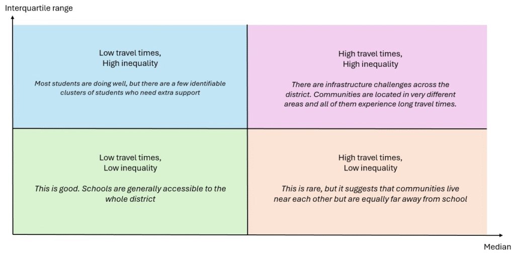 How can we address these gaps? The first step is to properly diagnose the challenge. Despite similar travel times, different districts can face very different challenges. In districts with low median travel times but high inequality, most students have good access, but there are pockets of vulnerable communities that can benefit from targeted, localised support. In districts with both high travel times and high inequality, many communities live in different areas and they are all far away from schools; only large-scale infrastructure upgrades such as new routes or schools can be helpful here.