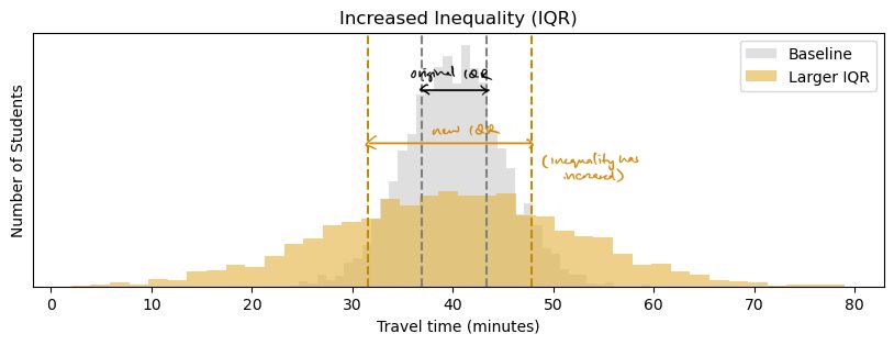A higher interquartile range means that some students are traveling much farther compared to most of the population, which shows high inequality.