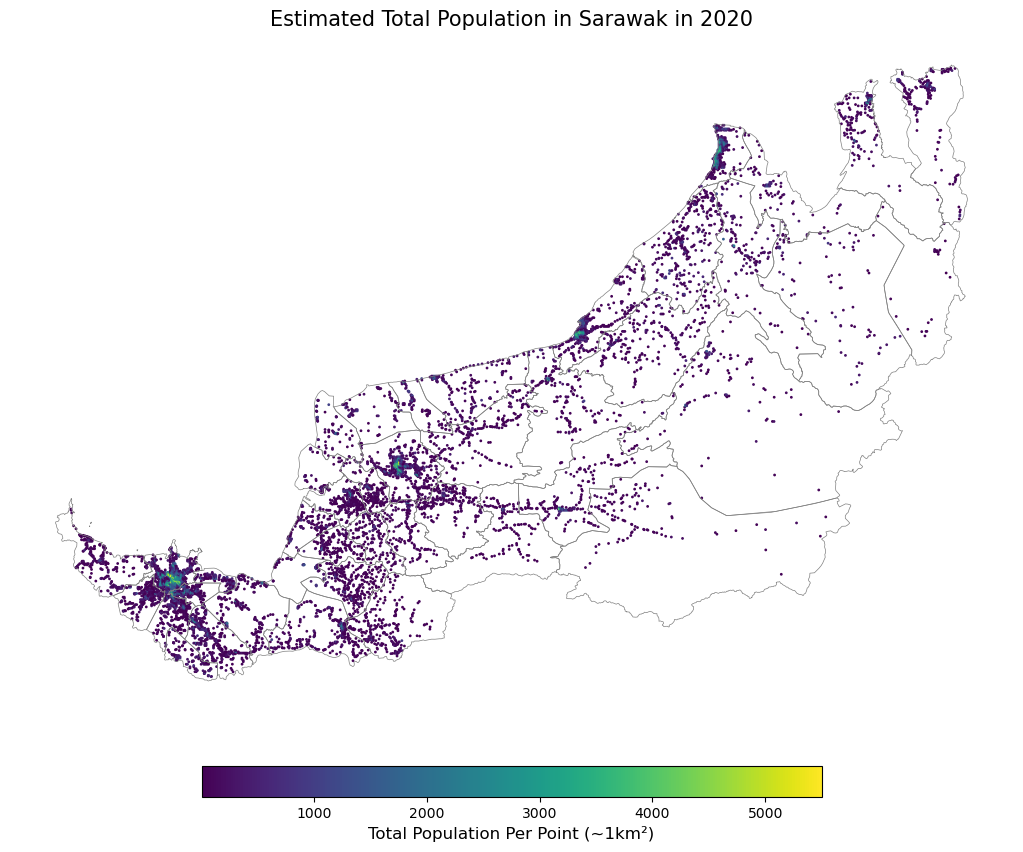 A static spatial dot plot of the estimated population in Sarawak.