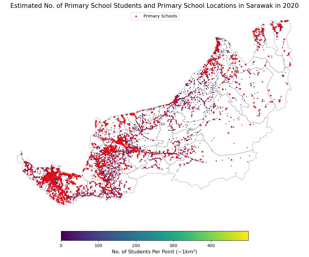A static spatial dot plot of the estimated primary school students and locations of primary schools in Sarawak.