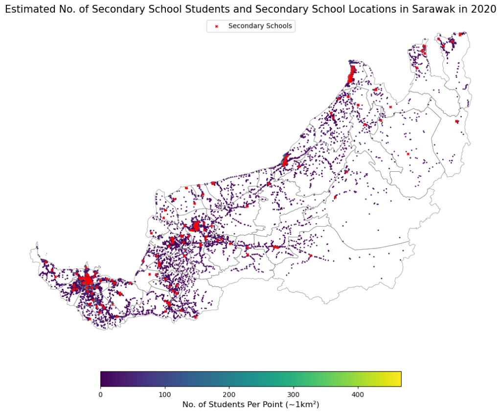 A static spatial dot plot of the estimated secondary school students and locations of secondary schools in Sarawak.