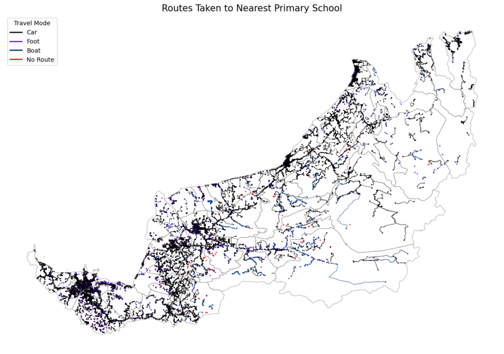 Using the foot, car, and boat routes for each population point, we identify the most likely travel mode. Walking is assumed when a school is within 1 km; car routes are preferred where possible; and boats are used when it is significantly faster (more than 20 mins faster) or it is the only route available. This is done for both primary and secondary schools.