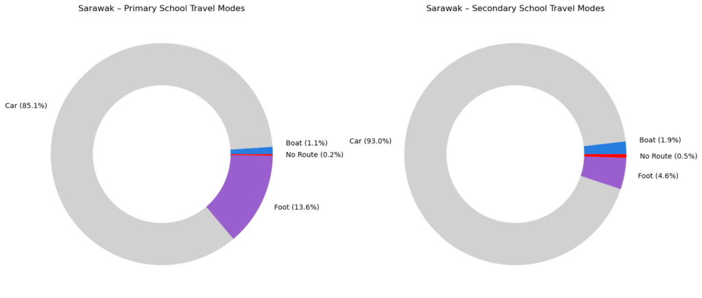 Overall in Sarawak, foot travel reduces from 13.6% to 4.6% between primary and secondary school. This reduction in foot travel translates to an increase in car travel (85.1% to 93.0%), boat travel (1.1% to 1.9%) and students with no detected routes.