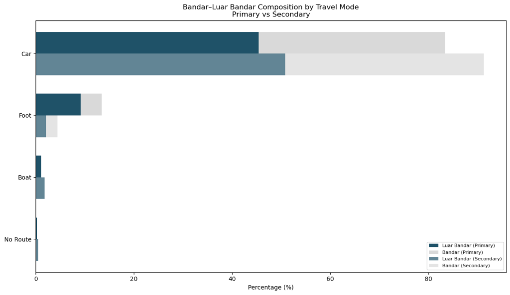 The change in travel modes broken down by bandar and luar-bandar areas. Note that ‘luar-bandar’ covers a broad range of non-urban contexts in Sarawak, including suburban and remote rural areas. In bandar areas, the decline in walking routes translates almost entirely to increased car use. In contrast, in luar-bandar areas, the reduction in walking routes translates to a mix of increased car and boat routes, as well as a growing share of students with no routes to school.