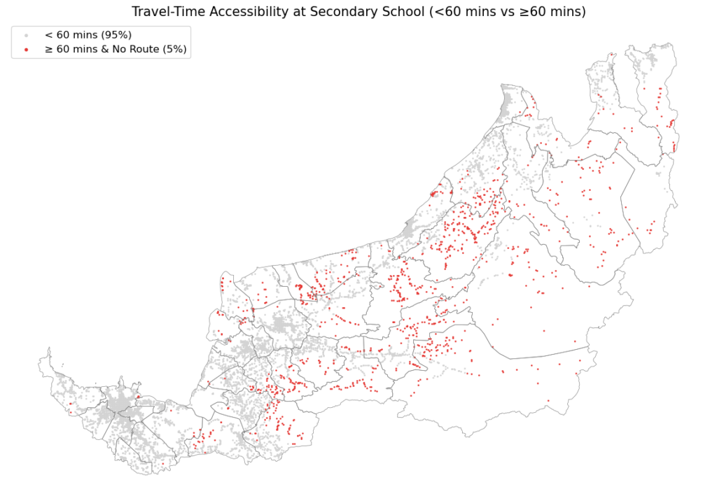 When students facing unrealistic travel times are grouped together, the scale of exclusion is even more pronounced. Combining both groups, about 1% of primary school students and 5% of secondary school students are effectively cut off from regular school access. Together, this accounts for a sizeable ~11,000 students.
