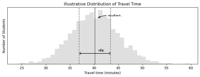 To show what these indicators mean, let’s plot an illustrative number of students and their travel times on the same graph.