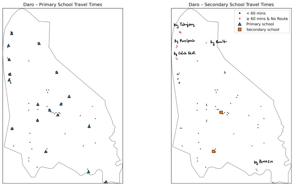 In contrast, Daro illustrates a low travel time, high inequality case. While most of the population is well connected, specific communities (i.e. Kampung Tekajong, Kampung Penipah, Kampung Salah Kecil Kampung Bruit and Kampung Penasu) remain disconnected from secondary schools. Here, the challenge is not district-wide access, but identifying and supporting a relatively small yet highly vulnerable group through targeted interventions.