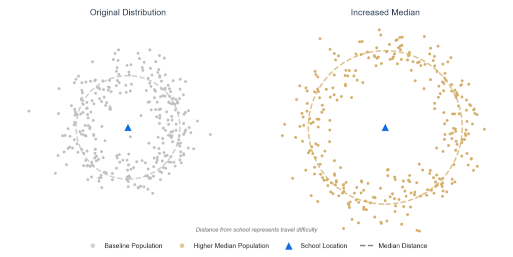 This is the travel time experienced by the student right in the middle of the population, a reflection of a ‘typical’ student experience.