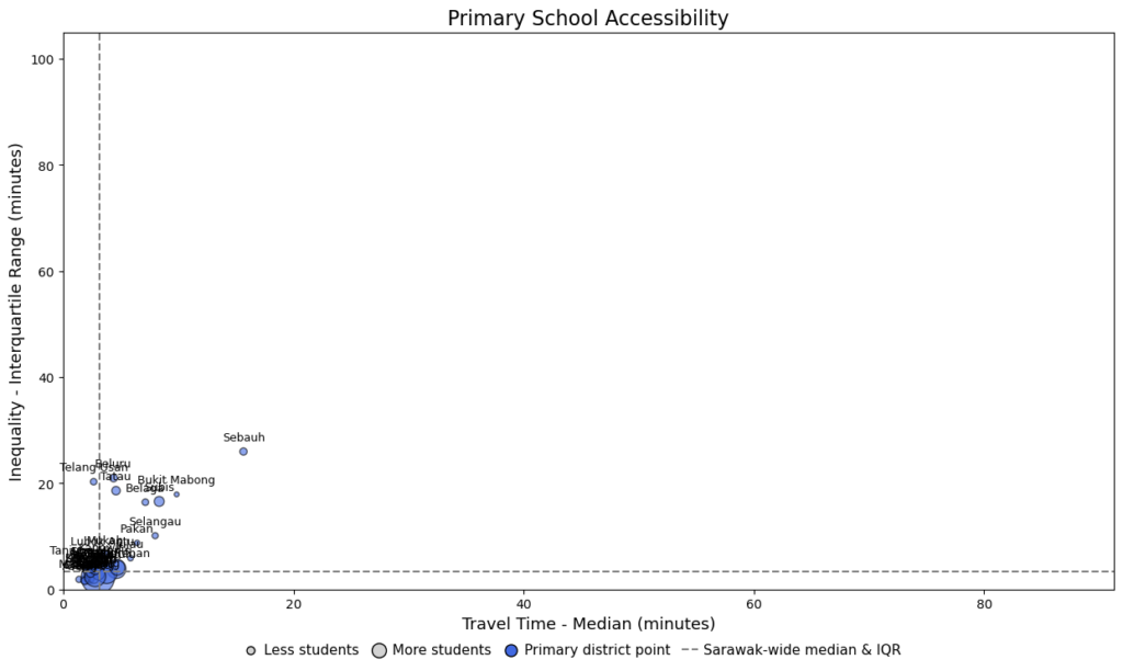 These districts are highlighted because they illustrate the archetypes most clearly. In practice, however, most districts fall along a spectrum rather than fitting neatly into fixed categories. Moreover, district-level indicators can mask important within-district differences. Even in well-performing districts like Kuching, there are still pockets of inaccessibility (i.e. Kampung Beradek and Kampung Semilang) that can be obscured when results are aggregated at the district level.